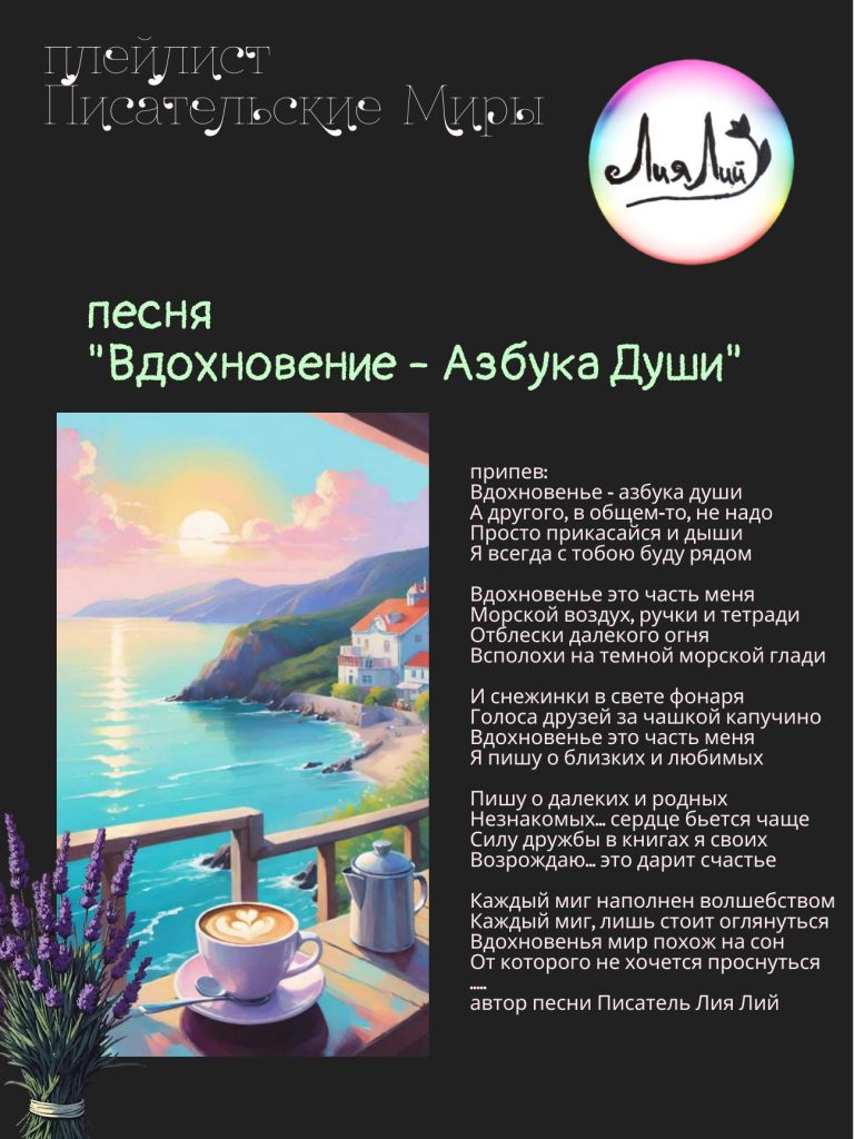 Вдохновенье — азбука души я написала, когда жила в Крыму. Впрочем, там можно уловить атмосферу снежной Москвы. Эти строки передают состояние писателя, который вдохновляется и уединением на морском берегу, и разговором в зимней кофейне. Волшебство это, по сути, умение смотреть на мир под особым углом. А еще способность подсветить этот угол так, чтобы его смогли увидеть и другие.